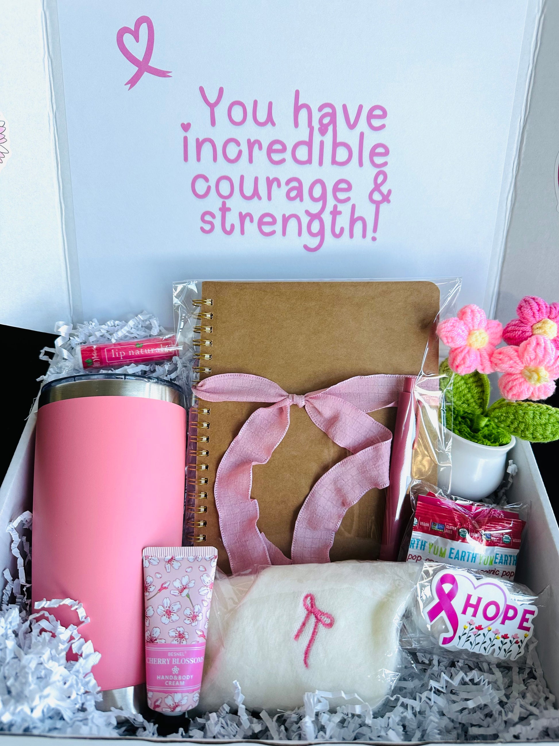 It includes a high-quality tumbler that ensures your beverages stay at the ideal temperature, paired with a thoughtfully designed journal and pen to support mindful reflection and personal growth. The elegant mini flower pot serves as a symbol of resilience and renewal, while nourishing chapstick and lotion offer soothing care for skin well-being. Complemented by carefully selected snacks for sustained energy, this box is a comprehensive solution to foster courage and empower the recipient through challenging moments.